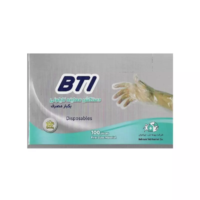 دستکش معاینه نایلونی یکبار مصرف بی تی آی 100 عددی