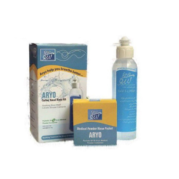 با 170 میلی لیتر آب ولرم یا سرد بطری را پر کنید. به منظور تهیه محلول هایپرتونیک سه بسته و برای تهیه محلول ایزوتونیک یک بسته پودر مخصوص آریو را در بطری بریزید. نی را کاملا در قسمت زیرین در بطری قرار دهید. به منظور حل کردن پودر آریو در آب ، بطری را خوب تکان دهید. نازل در قوطی را با بالا آوردن باز کنید دهان خود را باز کرده و نازل را روی یکی از سوراخ های بینی خود قرار دهید ، بطری آریو را به آرامی فشار داده تا محتویات آن از دهان یا سوراخ دیگر بینی شما خارج شوند. این عمل را چندین بار تکرار کنید و سپس همان کار را در سوراخ دیگر بینی خود تکرار کنید. پس از آن به آرامی در بینی خود بدمید.